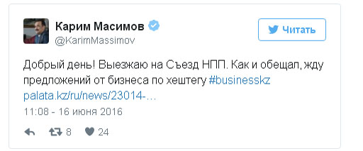 В пользу этого свидетельствует активная PR -кампания Масимова, запущенная им в середине июня текущего года в своем 100-тысячном twitter -аккаунте.